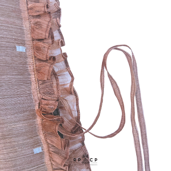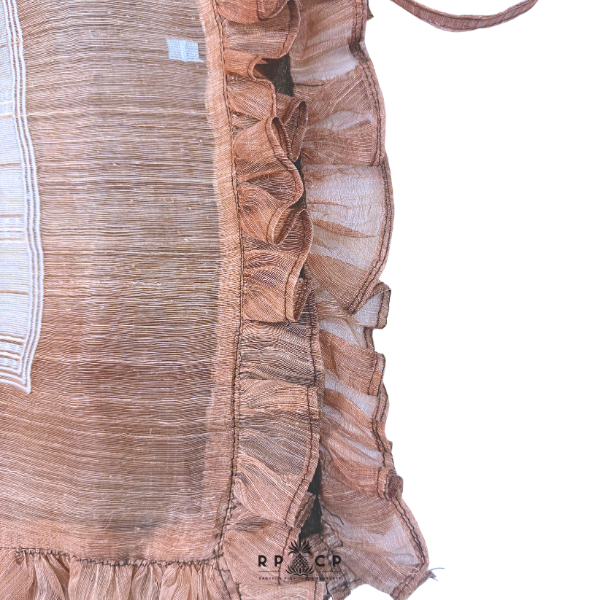 A breezy Poncho crafted from handloom woven piña seda with Barong Suksok Weave pattern. Naturally dyed in Buko(Coconut) and designed with 1.5 inches soft side ruffles that flow like waves as part of our Summer Story Series — a light and graceful piece for sunlit days and balmy nights.