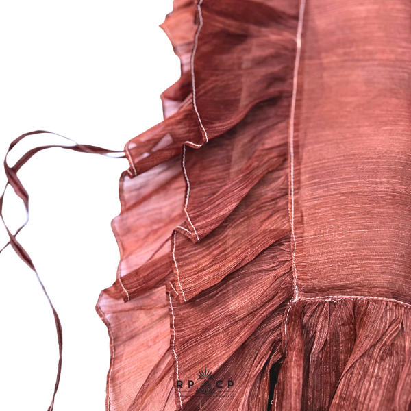 A breezy Poncho crafted from handloom woven piña seda Plain Weave pattern. Naturally dyed in Mahogany and designed with 3 inches soft side ruffles that flow like waves as part of our Summer Story Series — a light and graceful piece for sunlit days and balmy nights.