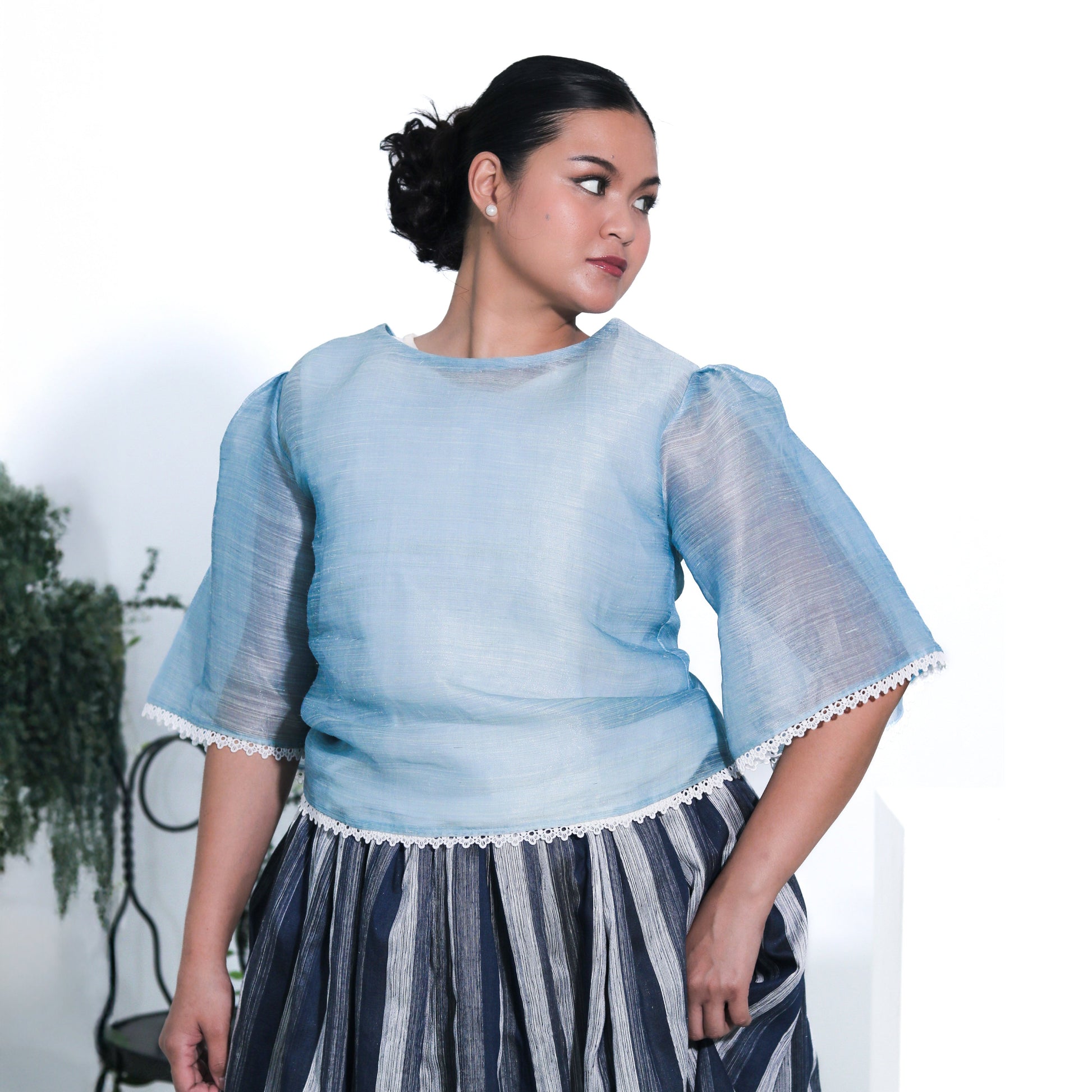 Contemporary Kimona short-sleeves made of plainly handloom woven Piña seda in light indigo, intricate lace accented hemlines,.